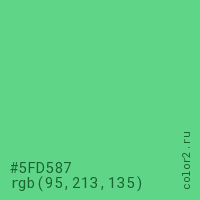 Цвет #5FD587 в цветовой модели RGB обозначается тремя октетами (95, 213, 135) в десятичном формате и #5FD587 в шестнадцатиричном (hex) формате, которые являются интенсивностью красного 95 (hex 5F), интенсивность зелёного 213 (hex D5) и интенсивность синего 135 (hex 87).