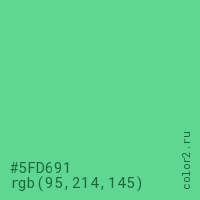 Цвет #5FD691 в цветовой модели RGB обозначается тремя октетами (95, 214, 145) в десятичном формате и #5FD691 в шестнадцатиричном (hex) формате, которые являются интенсивностью красного 95 (hex 5F), интенсивность зелёного 214 (hex D6) и интенсивность синего 145 (hex 91).