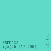 Цвет #5FD9C8 в цветовой модели RGB обозначается тремя октетами (95, 217, 200) в десятичном формате и #5FD9C8 в шестнадцатиричном (hex) формате, которые являются интенсивностью красного 95 (hex 5F), интенсивность зелёного 217 (hex D9) и интенсивность синего 200 (hex C8).
