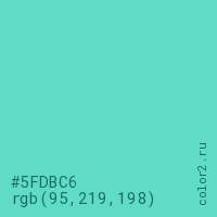 Цвет #5FDBC6 в цветовой модели RGB обозначается тремя октетами (95, 219, 198) в десятичном формате и #5FDBC6 в шестнадцатиричном (hex) формате, которые являются интенсивностью красного 95 (hex 5F), интенсивность зелёного 219 (hex DB) и интенсивность синего 198 (hex C6).