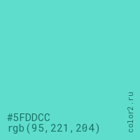Цвет #5FDDCC в цветовой модели RGB обозначается тремя октетами (95, 221, 204) в десятичном формате и #5FDDCC в шестнадцатиричном (hex) формате, которые являются интенсивностью красного 95 (hex 5F), интенсивность зелёного 221 (hex DD) и интенсивность синего 204 (hex CC).