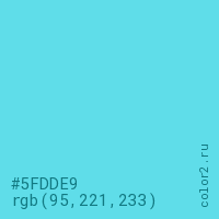 Цвет #5FDDE9 в цветовой модели RGB обозначается тремя октетами (95, 221, 233) в десятичном формате и #5FDDE9 в шестнадцатиричном (hex) формате, которые являются интенсивностью красного 95 (hex 5F), интенсивность зелёного 221 (hex DD) и интенсивность синего 233 (hex E9).