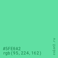 Цвет #5FE0A2 в цветовой модели RGB обозначается тремя октетами (95, 224, 162) в десятичном формате и #5FE0A2 в шестнадцатиричном (hex) формате, которые являются интенсивностью красного 95 (hex 5F), интенсивность зелёного 224 (hex E0) и интенсивность синего 162 (hex A2).
