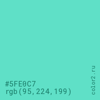 Цвет #5FE0C7 в цветовой модели RGB обозначается тремя октетами (95, 224, 199) в десятичном формате и #5FE0C7 в шестнадцатиричном (hex) формате, которые являются интенсивностью красного 95 (hex 5F), интенсивность зелёного 224 (hex E0) и интенсивность синего 199 (hex C7).