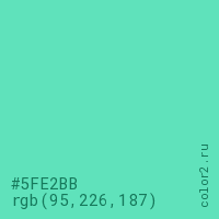 Цвет #5FE2BB в цветовой модели RGB обозначается тремя октетами (95, 226, 187) в десятичном формате и #5FE2BB в шестнадцатиричном (hex) формате, которые являются интенсивностью красного 95 (hex 5F), интенсивность зелёного 226 (hex E2) и интенсивность синего 187 (hex BB).