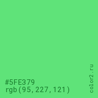 Цвет #5FE379 в цветовой модели RGB обозначается тремя октетами (95, 227, 121) в десятичном формате и #5FE379 в шестнадцатиричном (hex) формате, которые являются интенсивностью красного 95 (hex 5F), интенсивность зелёного 227 (hex E3) и интенсивность синего 121 (hex 79).
