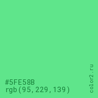 Цвет #5FE58B в цветовой модели RGB обозначается тремя октетами (95, 229, 139) в десятичном формате и #5FE58B в шестнадцатиричном (hex) формате, которые являются интенсивностью красного 95 (hex 5F), интенсивность зелёного 229 (hex E5) и интенсивность синего 139 (hex 8B).