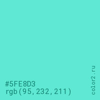 Цвет #5FE8D3 в цветовой модели RGB обозначается тремя октетами (95, 232, 211) в десятичном формате и #5FE8D3 в шестнадцатиричном (hex) формате, которые являются интенсивностью красного 95 (hex 5F), интенсивность зелёного 232 (hex E8) и интенсивность синего 211 (hex D3).