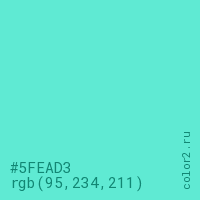 Цвет #5FEAD3 в цветовой модели RGB обозначается тремя октетами (95, 234, 211) в десятичном формате и #5FEAD3 в шестнадцатиричном (hex) формате, которые являются интенсивностью красного 95 (hex 5F), интенсивность зелёного 234 (hex EA) и интенсивность синего 211 (hex D3).
