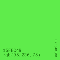 Цвет #5FEC4B в цветовой модели RGB обозначается тремя октетами (95, 236, 75) в десятичном формате и #5FEC4B в шестнадцатиричном (hex) формате, которые являются интенсивностью красного 95 (hex 5F), интенсивность зелёного 236 (hex EC) и интенсивность синего 75 (hex 4B).