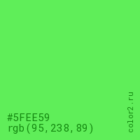 Цвет #5FEE59 в цветовой модели RGB обозначается тремя октетами (95, 238, 89) в десятичном формате и #5FEE59 в шестнадцатиричном (hex) формате, которые являются интенсивностью красного 95 (hex 5F), интенсивность зелёного 238 (hex EE) и интенсивность синего 89 (hex 59).