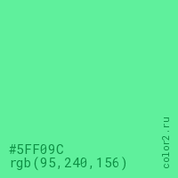 Цвет #5FF09C в цветовой модели RGB обозначается тремя октетами (95, 240, 156) в десятичном формате и #5FF09C в шестнадцатиричном (hex) формате, которые являются интенсивностью красного 95 (hex 5F), интенсивность зелёного 240 (hex F0) и интенсивность синего 156 (hex 9C).