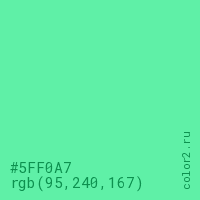 Цвет #5FF0A7 в цветовой модели RGB обозначается тремя октетами (95, 240, 167) в десятичном формате и #5FF0A7 в шестнадцатиричном (hex) формате, которые являются интенсивностью красного 95 (hex 5F), интенсивность зелёного 240 (hex F0) и интенсивность синего 167 (hex A7).