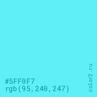 Цвет #5FF0F7 в цветовой модели RGB обозначается тремя октетами (95, 240, 247) в десятичном формате и #5FF0F7 в шестнадцатиричном (hex) формате, которые являются интенсивностью красного 95 (hex 5F), интенсивность зелёного 240 (hex F0) и интенсивность синего 247 (hex F7).