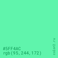 Цвет #5FF4AC в цветовой модели RGB обозначается тремя октетами (95, 244, 172) в десятичном формате и #5FF4AC в шестнадцатиричном (hex) формате, которые являются интенсивностью красного 95 (hex 5F), интенсивность зелёного 244 (hex F4) и интенсивность синего 172 (hex AC).
