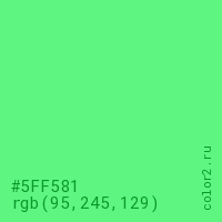 Цвет #5FF581 в цветовой модели RGB обозначается тремя октетами (95, 245, 129) в десятичном формате и #5FF581 в шестнадцатиричном (hex) формате, которые являются интенсивностью красного 95 (hex 5F), интенсивность зелёного 245 (hex F5) и интенсивность синего 129 (hex 81).