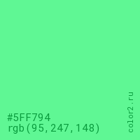 Цвет #5FF794 в цветовой модели RGB обозначается тремя октетами (95, 247, 148) в десятичном формате и #5FF794 в шестнадцатиричном (hex) формате, которые являются интенсивностью красного 95 (hex 5F), интенсивность зелёного 247 (hex F7) и интенсивность синего 148 (hex 94).