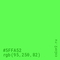 Цвет #5FFA52 в цветовой модели RGB обозначается тремя октетами (95, 250, 82) в десятичном формате и #5FFA52 в шестнадцатиричном (hex) формате, которые являются интенсивностью красного 95 (hex 5F), интенсивность зелёного 250 (hex FA) и интенсивность синего 82 (hex 52).