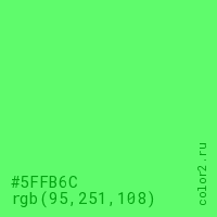 Цвет #5FFB6C в цветовой модели RGB обозначается тремя октетами (95, 251, 108) в десятичном формате и #5FFB6C в шестнадцатиричном (hex) формате, которые являются интенсивностью красного 95 (hex 5F), интенсивность зелёного 251 (hex FB) и интенсивность синего 108 (hex 6C).