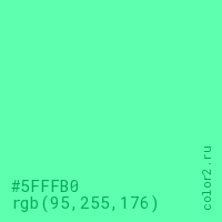 Цвет #5FFFB0 в цветовой модели RGB обозначается тремя октетами (95, 255, 176) в десятичном формате и #5FFFB0 в шестнадцатиричном (hex) формате, которые являются интенсивностью красного 95 (hex 5F), интенсивность зелёного 255 (hex FF) и интенсивность синего 176 (hex B0).