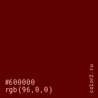 Цвет #600000 в цветовой модели RGB обозначается тремя октетами (96, 0, 0) в десятичном формате и #600000 в шестнадцатиричном (hex) формате, которые являются интенсивностью красного 96 (hex 60), интенсивность зелёного 0 (hex 00) и интенсивность синего 0 (hex 00).