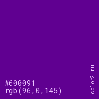 Цвет #600091 в цветовой модели RGB обозначается тремя октетами (96, 0, 145) в десятичном формате и #600091 в шестнадцатиричном (hex) формате, которые являются интенсивностью красного 96 (hex 60), интенсивность зелёного 0 (hex 00) и интенсивность синего 145 (hex 91).