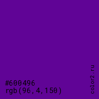 Цвет #600496 в цветовой модели RGB обозначается тремя октетами (96, 4, 150) в десятичном формате и #600496 в шестнадцатиричном (hex) формате, которые являются интенсивностью красного 96 (hex 60), интенсивность зелёного 4 (hex 04) и интенсивность синего 150 (hex 96).