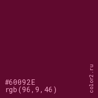 Цвет #60092E в цветовой модели RGB обозначается тремя октетами (96, 9, 46) в десятичном формате и #60092E в шестнадцатиричном (hex) формате, которые являются интенсивностью красного 96 (hex 60), интенсивность зелёного 9 (hex 09) и интенсивность синего 46 (hex 2E).