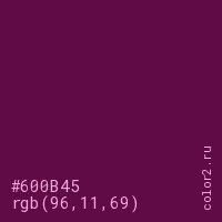 Цвет #600B45 в цветовой модели RGB обозначается тремя октетами (96, 11, 69) в десятичном формате и #600B45 в шестнадцатиричном (hex) формате, которые являются интенсивностью красного 96 (hex 60), интенсивность зелёного 11 (hex 0B) и интенсивность синего 69 (hex 45).