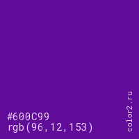 Цвет #600C99 в цветовой модели RGB обозначается тремя октетами (96, 12, 153) в десятичном формате и #600C99 в шестнадцатиричном (hex) формате, которые являются интенсивностью красного 96 (hex 60), интенсивность зелёного 12 (hex 0C) и интенсивность синего 153 (hex 99).