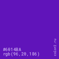 Цвет #6014BA в цветовой модели RGB обозначается тремя октетами (96, 20, 186) в десятичном формате и #6014BA в шестнадцатиричном (hex) формате, которые являются интенсивностью красного 96 (hex 60), интенсивность зелёного 20 (hex 14) и интенсивность синего 186 (hex BA).