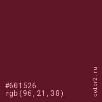 Цвет #601526 в цветовой модели RGB обозначается тремя октетами (96, 21, 38) в десятичном формате и #601526 в шестнадцатиричном (hex) формате, которые являются интенсивностью красного 96 (hex 60), интенсивность зелёного 21 (hex 15) и интенсивность синего 38 (hex 26).