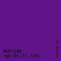 Цвет #601586 в цветовой модели RGB обозначается тремя октетами (96, 21, 134) в десятичном формате и #601586 в шестнадцатиричном (hex) формате, которые являются интенсивностью красного 96 (hex 60), интенсивность зелёного 21 (hex 15) и интенсивность синего 134 (hex 86).
