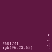 Цвет #601741 в цветовой модели RGB обозначается тремя октетами (96, 23, 65) в десятичном формате и #601741 в шестнадцатиричном (hex) формате, которые являются интенсивностью красного 96 (hex 60), интенсивность зелёного 23 (hex 17) и интенсивность синего 65 (hex 41).