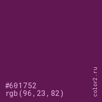 Цвет #601752 в цветовой модели RGB обозначается тремя октетами (96, 23, 82) в десятичном формате и #601752 в шестнадцатиричном (hex) формате, которые являются интенсивностью красного 96 (hex 60), интенсивность зелёного 23 (hex 17) и интенсивность синего 82 (hex 52).