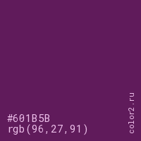 Цвет #601B5B в цветовой модели RGB обозначается тремя октетами (96, 27, 91) в десятичном формате и #601B5B в шестнадцатиричном (hex) формате, которые являются интенсивностью красного 96 (hex 60), интенсивность зелёного 27 (hex 1B) и интенсивность синего 91 (hex 5B).