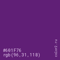 Цвет #601F76 в цветовой модели RGB обозначается тремя октетами (96, 31, 118) в десятичном формате и #601F76 в шестнадцатиричном (hex) формате, которые являются интенсивностью красного 96 (hex 60), интенсивность зелёного 31 (hex 1F) и интенсивность синего 118 (hex 76).