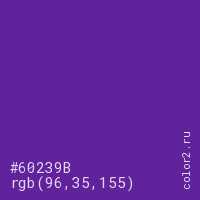 Цвет #60239B в цветовой модели RGB обозначается тремя октетами (96, 35, 155) в десятичном формате и #60239B в шестнадцатиричном (hex) формате, которые являются интенсивностью красного 96 (hex 60), интенсивность зелёного 35 (hex 23) и интенсивность синего 155 (hex 9B).