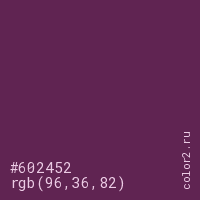 Цвет #602452 в цветовой модели RGB обозначается тремя октетами (96, 36, 82) в десятичном формате и #602452 в шестнадцатиричном (hex) формате, которые являются интенсивностью красного 96 (hex 60), интенсивность зелёного 36 (hex 24) и интенсивность синего 82 (hex 52).