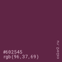 Цвет #602545 в цветовой модели RGB обозначается тремя октетами (96, 37, 69) в десятичном формате и #602545 в шестнадцатиричном (hex) формате, которые являются интенсивностью красного 96 (hex 60), интенсивность зелёного 37 (hex 25) и интенсивность синего 69 (hex 45).
