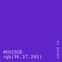 Цвет #6025CB в цветовой модели RGB обозначается тремя октетами (96, 37, 203) в десятичном формате и #6025CB в шестнадцатиричном (hex) формате, которые являются интенсивностью красного 96 (hex 60), интенсивность зелёного 37 (hex 25) и интенсивность синего 203 (hex CB).