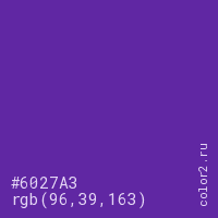 Цвет #6027A3 в цветовой модели RGB обозначается тремя октетами (96, 39, 163) в десятичном формате и #6027A3 в шестнадцатиричном (hex) формате, которые являются интенсивностью красного 96 (hex 60), интенсивность зелёного 39 (hex 27) и интенсивность синего 163 (hex A3).