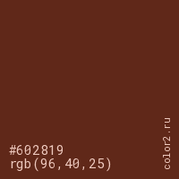 Цвет #602819 в цветовой модели RGB обозначается тремя октетами (96, 40, 25) в десятичном формате и #602819 в шестнадцатиричном (hex) формате, которые являются интенсивностью красного 96 (hex 60), интенсивность зелёного 40 (hex 28) и интенсивность синего 25 (hex 19).