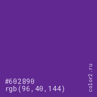 Цвет #602890 в цветовой модели RGB обозначается тремя октетами (96, 40, 144) в десятичном формате и #602890 в шестнадцатиричном (hex) формате, которые являются интенсивностью красного 96 (hex 60), интенсивность зелёного 40 (hex 28) и интенсивность синего 144 (hex 90).