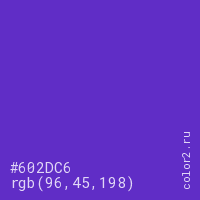 Цвет #602DC6 в цветовой модели RGB обозначается тремя октетами (96, 45, 198) в десятичном формате и #602DC6 в шестнадцатиричном (hex) формате, которые являются интенсивностью красного 96 (hex 60), интенсивность зелёного 45 (hex 2D) и интенсивность синего 198 (hex C6).