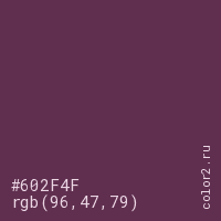 Цвет #602F4F в цветовой модели RGB обозначается тремя октетами (96, 47, 79) в десятичном формате и #602F4F в шестнадцатиричном (hex) формате, которые являются интенсивностью красного 96 (hex 60), интенсивность зелёного 47 (hex 2F) и интенсивность синего 79 (hex 4F).