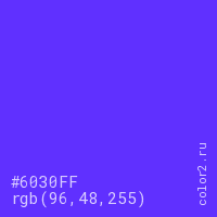 Цвет #6030FF в цветовой модели RGB обозначается тремя октетами (96, 48, 255) в десятичном формате и #6030FF в шестнадцатиричном (hex) формате, которые являются интенсивностью красного 96 (hex 60), интенсивность зелёного 48 (hex 30) и интенсивность синего 255 (hex FF).