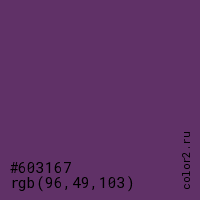 Цвет #603167 в цветовой модели RGB обозначается тремя октетами (96, 49, 103) в десятичном формате и #603167 в шестнадцатиричном (hex) формате, которые являются интенсивностью красного 96 (hex 60), интенсивность зелёного 49 (hex 31) и интенсивность синего 103 (hex 67).