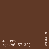 Цвет #603926 в цветовой модели RGB обозначается тремя октетами (96, 57, 38) в десятичном формате и #603926 в шестнадцатиричном (hex) формате, которые являются интенсивностью красного 96 (hex 60), интенсивность зелёного 57 (hex 39) и интенсивность синего 38 (hex 26).