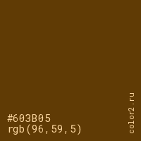 Цвет #603B05 в цветовой модели RGB обозначается тремя октетами (96, 59, 5) в десятичном формате и #603B05 в шестнадцатиричном (hex) формате, которые являются интенсивностью красного 96 (hex 60), интенсивность зелёного 59 (hex 3B) и интенсивность синего 5 (hex 05).